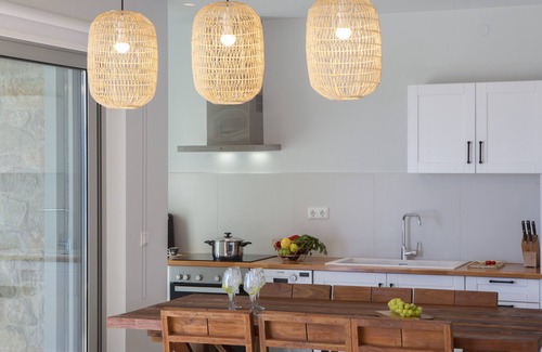 Inside, the villa boasts an open-concept living area with a spacious and beautifully decorated living room, a dining area, and a fully equipped kitchen. The interior design is a harmonious blend of contemporary style and traditional Greek elements, creating a warm and inviting atmosphere.