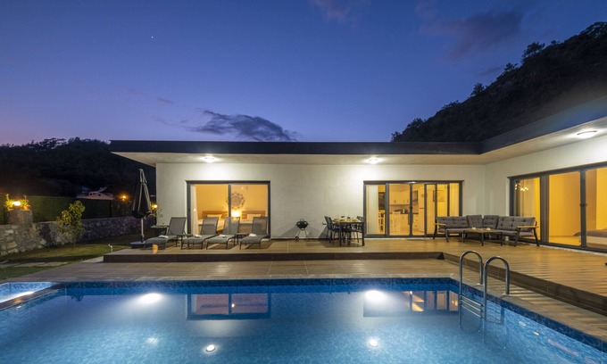 Located in Göcek İnlice, Villa Aloha has a capacity of 4 people with its own pool, large garden and 2 bedrooms. With its proximity to Dalaman Airport, it has an advantageous location for our guests traveling without a car. Villa Aloha, whose construction was completed in 2022, has options such as underfloor heating, heated indoor pool and sauna, designed to meet the needs of our guests by being designed to be rented all year. Inlice Beach is also 900 meters away from our villa. Since the beach with recreational facilities is sandy, it is preferred for families with children.