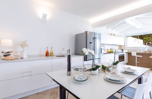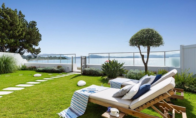 The recently renovated Villa Amar is located a few kilometres from Olbia on the beach of Mare e Rocce (Sea and Rocks), one of the most beautiful and renowned beaches of Pittulongu, namely the long seaboard between Olbia and Golfo Aranci. The single-floor villa stands in a privileged position because it is at the end of an extremely white beach in an inlet with a turquoise-coloured sea. The property has a pulsing, modern architectural style enhanced by essential lines and well defined by light colour, built to resemble a boat on the beach with a splendid view of the sea. It has “one foot in the water” since the access gate leads directly to the beach. Great quality in the elegant, refined and simple interior with clean, dry lines that enjoy splendid natural light emphasized by the light tones. The spacious, bright and cosy living area opens, through a large window, onto the covered patio which leads to a wonderful sensory garden which welcomes its guests, and to the sea with its splendid contrasts of bright, intense colour, mixed with the winds and breezes wafting the perfume of the myrtle and helichrysum of Sardinia.