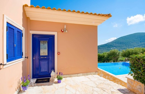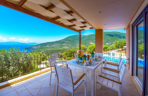 The villa offers spectacular views of the azure waters of the Ionian Sea and theislands, including Kefalonia, Ithaca and Meganissi.
