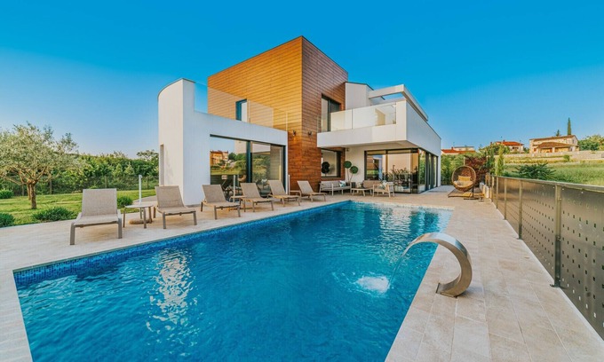 "Escape to a peaceful haven with a view over the sea."Villa Aria is a beautiful retreat in Central Istria, located in the charming village of Višnjan. With space for up to 12 guests, this villa offers 5 comfortable bedrooms, each with a double bed, and a double sofa bed on the ground floor. The villa has 4 modern bathrooms, making it ideal for families or groups of friends.This pet-friendly villa (with an added pet fee) welcomes young groups too, though a double deposit is required for extra security. Outside, you'll find a stunning 32 m² saltwater pool surrounded by 8 sunbeds and 3 large sun umbrellas, perfect for relaxing by the water. A private sauna (available for additional fee) and jacuzzi are standout features, allowing guests to unwind while taking in the beautiful sea view.For outdoor activities, the villa provides 4 bikes to explore the local area. For entertainment, there’s a darts setup and a pool table, great for children and adults alike.Villa also has tavern with indoor barbeque as well as another outdoor barbeque available to use.Villa Aria blends relaxation with a touch of luxury, making it a perfect escape for those looking to enjoy Istria’s natural beauty and comforts.