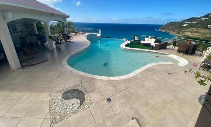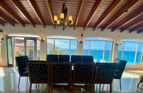 Unwind in this beautiful opened concept Dutch side Villa. With stunning views of the ocean from a very spacious deck and large infinity pool, you can relax on the deck for hours. Love basketball, then play a game of 21 or H.O.R.S.E with an adjacent basketball half court. Villa has 5 Bedrooms, 4 and 1/2 Bathrooms, Den, Living room with ethnic swing, Fully stocked Kitchen, Washer/Dryer, & Wifi. Only 7 minutes or less from the supermarket, shopping, dining, casino, beach and marina.