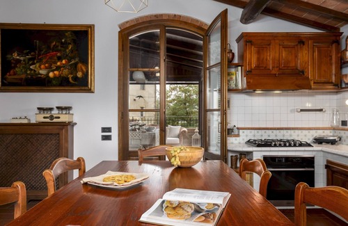Villa Binetti is a former country barn, now restored and expanded into a characteristic Tuscan villa located in a small village near San Gimignano. Preserving the traditional terracotta floors, wooden beams and original stone ventilation grilles, the villa offers modern comfort in a timeless rural setting. Furnished in a classic country style, with works of art and antique furniture, the villa is spread over two floors and includes a living room, a kitchen with direct access to a furnished terrace and four bedrooms. The fenced garden is enriched by mature trees, terracotta pots with flowering plants, a stone fountain and a wrought-iron gazebo. A stone staircase leads to a separate pool area on a lower level, surrounded by olive trees and an orchard. The location of the villa guarantees privacy, while offering easy access to San Gimignano, Siena, Florence and the Chianti area.