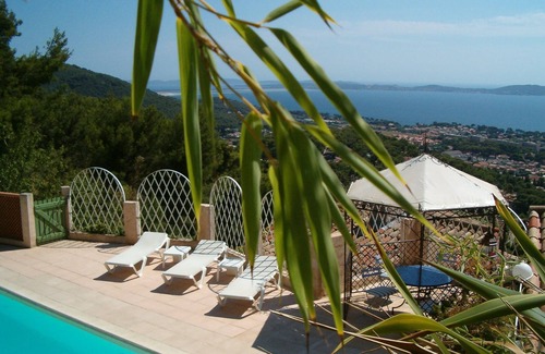 The pool is private, overhanging offering an exceptional 180° view of the sea, people's island and Porquerolles Island. Pool access is by a staircase visible on photos, pool access is highly secure and fully fenced. The pool is private and reserved for your exclusive use You will be alone, 2 Hawaiian umbrellas, relax, stone table under glory with chairs, wrought iron armchair. NB: People not listed on the reservation, accommodated elsewhere, are not allowed to use the facilities. Any "invitation" even for a meal must be subject to prior agreement.