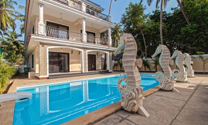 Villa Calangute Phase 10-6BHK is an extraordinary mansion situated in Calangute, Goa. This stunning vacation rental is located in a quiet residential area just a 10 minutes walk from Calangute Beach. The private swimming pool, kids pool, pergola and sea horse fountains are a firm favorite.