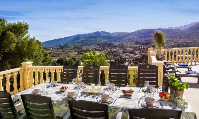 Very large, modern, very comfortable villa "Cara Mull Alcalalí", 2 storeys, built in 2020, surrounded by trees, meadows and vineyards. In the resort Alcalalí, 20 km from the centre of Calpe,Dénia,Javea,Moraira,Altea, in a quiet, sunny, elevated position, 17 km from the sea, 17 km from the beach, south facing position. Private: property 2'500 m2, large, beautiful, well-kept terraced garden wildlife garden and trees, swimming pool (15 x 6 m, depth 130 - 200 cm, seasonal availability: 01.Jan. - 31.Dec.) with internal staircase. Outdoor shower, pergola, terrace, garden furniture, barbecue, pool maintenance by the owner/gardener. In the house: lift, central heating system, air conditioning, laundry, washing machine, tumble dryer. Parking (for 5 cars) on the premises. Shop 600 m, supermarket 3 km, shopping centre 550 m, restaurant, bakery 600 m, café 500 m, bicycle rental 2 km, bus stop 22 km, railway station 21 km, ferry 22 km. Walking paths from the house 500 m. Nearby attractions: Rastro/Flea Market de Jalón 3 km, Parque Natural del Peñón de Ifach 17 km, Port de l'Olla de Altea 16 km, Fuentes del Algar 12 km. Hiking paths: cicloturismo 50 m. Please note: car recommended. The owner does not accept any youth groups.