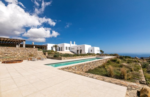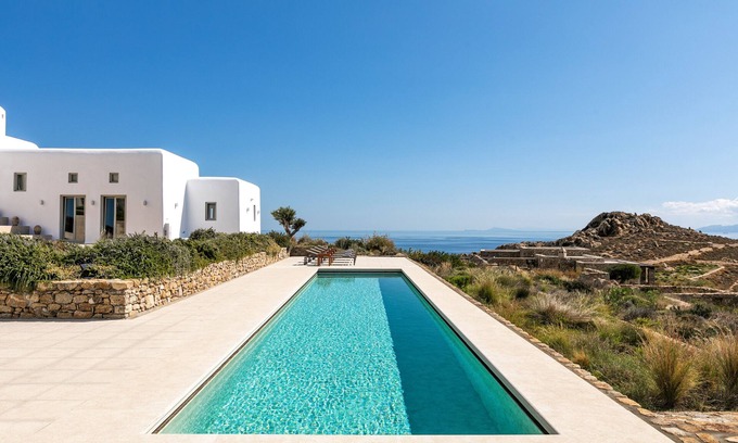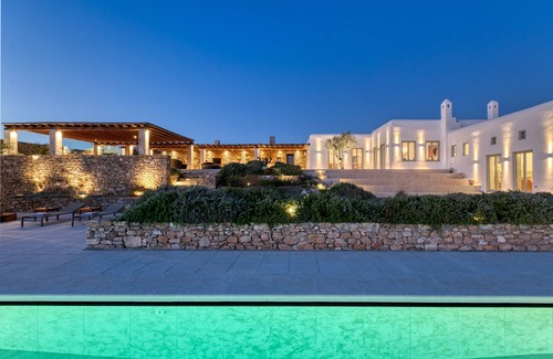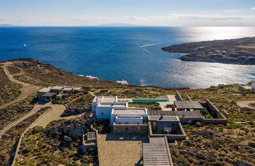The estate affords endless views to the south, showcasing a panorama of islands: Donousa, Naxos, Paros, Antiparos, and Ios. This unique property, which sleeps eleven people, is the most exciting rental property to sparkle on the Mykonian scene for a long time.
