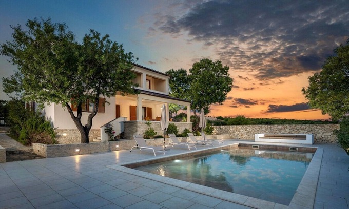 Villa Chiara is a newly renovated, very comfortable and tastefully decorated villa with a swimming pool, suitable for 6 - 7 people. It is located in the village of Gornja Slivnica, just 12 km from the city of Zadar. The house is located on a plot of 2800 m2 with a private swimming pool of 50 m2. On the ground floor there is a spacious living room connected to the kitchen, a large dining table, a sofa bed and a bathroom with a shower. The living room has direct access to the terrace equipped with seating furniture. All rooms are located on the ground floor. There are also two bedrooms: one with a double bed and a single bed, and the other with a double bed. One bedroom has its own bathroom. The kitchen is fully equipped. The house is fully air-conditioned, also has SAT TV, Wi-Fi, a safe and a washing machine. The villa is surrounded by a beautiful spacious garden with a terrace, a barbecue area with a large stone table and private parking. The nearest beach is only 2.5 km away.