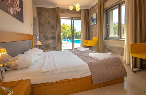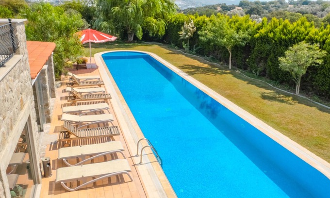 Family Holiday Villa with private pool in Bodrum Turkey at Ortakent, Bodrum. Sleeps 10 private location Villa Clara in Ortakent, Bodrum is a large and spacious family or couples holiday villa for leisure and pleasure. Set in large mature private gardens Villa Clara ensures privacy to its guests This villa can sleep 10 guests and has a large private pool, 25m x 5m Olympic size, a lovely veranda for shaded seating and extensive lawned garden, You are sure to have enough room for your whole group throughout the 5 bedrooms, 5 bathrooms and stylish living space. However, if you do wish to explore the local area and get out for a while you are only 800m away from the nearest resort for all you may need. Inside Villa Clara there is a clever mix of modern and traditional chic, creating a very pleasant stylish look, unfussy, clean and uncluttered. Stone walls and beamed ceilings help keep the villa cool (there is also full A/C throughout the villa). The entrance floor has 2 double ensuite bedrooms and a further 3 bedrooms are on the first floor. Villa makes an ideal choice for family holidays and large groups.