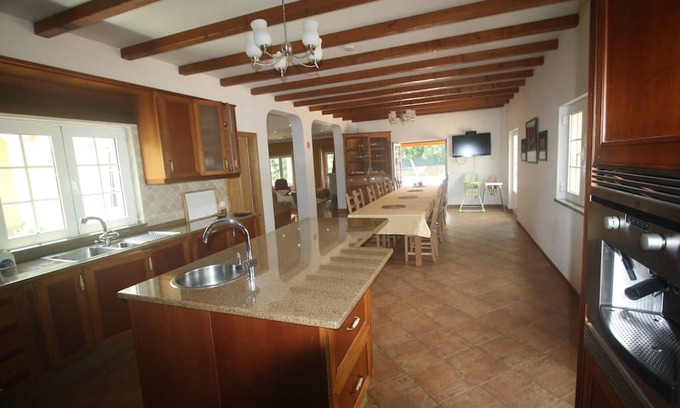The villa has 9 bedrooms and additional beds, with 8 bathrooms, 5 of which are en suite. 8 bedrooms have air condicioned, wifi , Satelite TVs, Brithish,Germans channels avaliable ,a vídeo projector full hd screen 200" may films from pc (more than a 1000 avaliable,