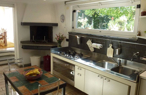 On the lower floor there is the reading room and then the fully gourmet equipped kitchen with barbecue. In the kitchen you will find LAVAZZA COFFEE MAKER, american coffee maker, blender and mixer, microwave, electric kettle, toaster. From the kitchen we have direct access to the dining room in the veranda facing the garden and the outside small kitchen with 2 stoves and barbecue.