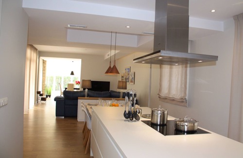 Villa Cristina is located in the quiet urbanization of Rocas Doradas, 50 meters from the "Bon Caponet" beach and 5 minutes from the urban center of Ametlla de Mar. The house is composed of ground floor and first floor, has 8 bedrooms and 3 bathrooms for accommodation of up to 18 guests. In the area of the ground floor we have a large terrace with southeast orientation around the pool with direct access from the spacious living room, its completely renovated interior is composed of an open kitchen fully equipped with an elegant central island of Dekton that extends To form a side table of the same material, from the kitchen we can access a covered outdoor barbecue. The adjoining living room, dominated by an elegant sofa, has a TV with parabolic connection and since the whole house is WI-FI, from the living room through the huge windows you can see the entire pool area and terrace . Finally the dining room is an attached room that is on the side of the room and can be accessed directly or by the terrace since its folding windows located on two of its four walls allow to have the space connected to the pool area creating a single environment. In the north wing of the ground floor there are 3 double bedrooms and a bathroom. The first floor houses the rest of the 5 double bedrooms and the two bathrooms that complete the accommodation. It should be added that the house has air conditioning in all rooms, as well as a small stove in the dining room for the winter months. capacity for 6 vehicles inside the farm.