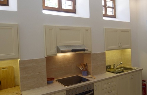 On the ground floor, there are three double bedrooms, (all with en suite bathrooms with shower), including a traditional Patmian wooden built double bed. and a double bed which can be separated to two singles. The ground floor has its own living/dining room and a fully equipped kitchen.