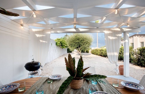 The exterior of the villa is a true paradise of open spaces and relaxation. A lush English lawn surrounds the property, creating an airy atmosphere. The veranda, shaded by a pergola, becomes the beating heart of the days: here you can enjoy outdoor lunches and dinners, prepared in the outdoor kitchen equipped with a hob, refrigerator, and barbecue. A living corner, furnished with comfortable outdoor armchairs and a sofa, invites you to relax and enjoy an evening aperitif, admiring the sunset over the cliff. The 8x6 meter swimming pool, surrounded by a solarium with deck chairs and straw canopies, promises moments of pure fun and relaxation. From the garden, an automatic gate leads directly to the cliff and the sea, while charming dry stone walls of local white stone delimit the property. For your convenience, there is also an outdoor laundry room and an outdoor bathroom near the pool.