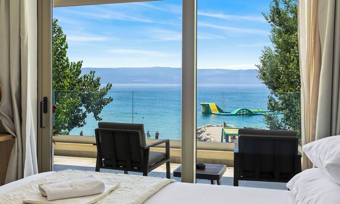 Discover the epitome of luxury at Beachfront Villa Erce, located directly on the pristine sandy beaches of Duće near Omiš. This exquisite villa offers an exceptional experience for family reunions or groups of friends, blending modern amenities with breathtaking natural beauty.