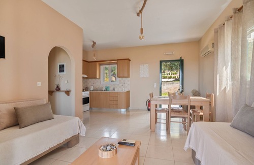 Villa Evridiki, part of a complex, is the ideal choice for a quiet and relaxing holiday in Kefalonia. You have a spacious balcony with stunning views of the Ionian Sea, a bright bedroom, a fully equipped kitchen, and a comfortable living room with two beds, accommodating up to four adults or five people including children. You enjoy direct access to a shared pool and lush gardens, perfect for relaxation. Free private parking, daily cleaning, Wi-Fi, and all essentials for a comfortable stay are provided. The villa is 15 minutes from Argostoli and 1 km from the beach, close to cafés, tavernas, and a mini market.