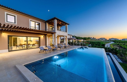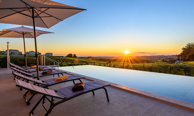 In the greenery of Vižinada hills, overlooking the vineyards with beautiful sea views, there is a luxurious Villa Faloniga. It got its name from a nearby natural water source, which gives life since ancient times.