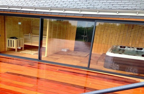 The house is built on the ground floor, a large and beautiful living room with a fully equipped open kitchen, two bedrooms, a bathroom and a toilet. Upstairs, three bedrooms: two bedrooms each with a double bed and a bedroom with 3 single beds. A bathroom and a bathroom complete the floor. Four cars can park in the property. In the basement, there is a fully equipped laundry room. Sauna and jacuzzi available in the spring of 2020.