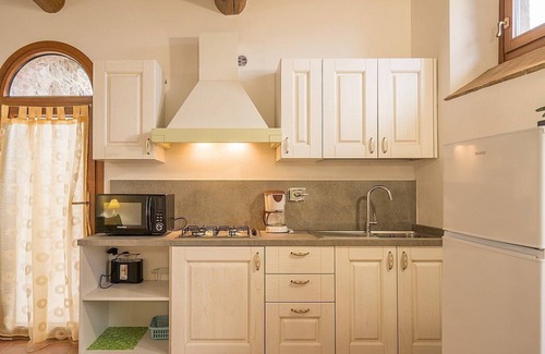 You will be able to enter the fifth kitchen through an external access. The floor is paved with terracotta tiles. The ceiling has characteristic exposed wood beams. The furnishings are simple and comfortable. It is equipped with a four-burner gas cooker, a small electric oven, a refrigerator with freezer and an Italian-style coffee-maker. The dining table can accommodate four guests. The furnishings of the kitchen include two armchairs. The kitchen has a window.