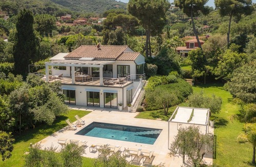 The villa stands within a completely enclosed park of 3000 sq m, consisting of lawn, pines, cypresses, olive trees, holm oaks, laurels and myrtles guaranteeing many natural areas of shade. Just 100 metres from the park is the beach of Straccoligno, reached directly from the garden along a footpath, with private bathrooms, umbrellas and sunbeds for a fee, as well as small snack bars and restaurants (only in summer). The large panoramic, sea-view terrace on the first floor is covered by an airy wooden pergola in zero-impact wood and thatch, and has a dining area and outdoor living area, where you can enjoy the sea breeze and the scents of the Mediterranean scrub, and a flight of steps leading directly to the pool area. Within the property is a private, uncovered, 4-car parking space. A brickwork barbecue is located at the back of the villa.Please notice that photos are taken in spring, therefore flower blossoming, and the colours of the gardens' grass could be different at the moment of your arrival at the villa.