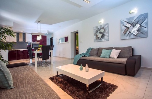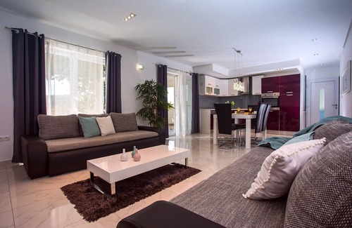 Villa Golden Garden offers comfortable accommodation for 4+2 people. From the parking lot, you are entering to a spacious living and dining area with strong air-condition, fully equipped kitchen, TV, Wi-Fi, exit to the terrace with outdoor dining area and lounge. There are two nicely decorated bedrooms, both with queen size bed 160cmx200cm. Between these bedrooms, there is a family bathroom with shower and washing machine. In the hall, there is also an additional toilet.