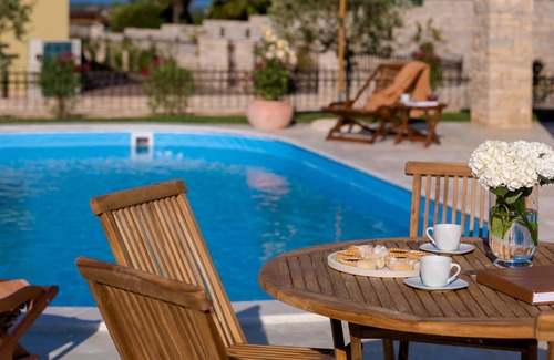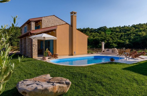 Beautiful single-family house "Villa Griota", 2 storeys. In the hamlet Vardica 5 km from the centre of Umag, in a quiet, sunny position, 5 km from the sea. Private: property 900 m2 (fenced), garden with lawn and wildlife garden, swimming pool (8 x 4 m, depth 135 cm, seasonal availability: 27.Apr. - 14.Sep.). Outdoor shower, hot tub, pergola (20 m2), garden furniture, barbecue. In the house: internet access, central heating system, washing machine. Parking (for 2 cars) at the house on the premises. Shop 5 km, supermarket 5 km, restaurant 2 km, bus stop 3.7 km, pebble beach 5 km, rocky beach 5 km. Tennis 7 km, walking paths from the house 100 m, cycle lane 150 m. For shared use: storage room for bicycles.
