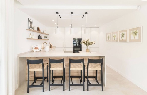The modern and bright living room stands out for its large windows that flood the space with natural light and offer stunning views of the pool and garden. The kitchen, fully equipped with high-end appliances, is designed to make preparing any meal a pleasant experience. Next to the kitchen is a spacious indoor dining area with enough seating for all guests and direct access to the outdoor terrace.