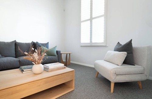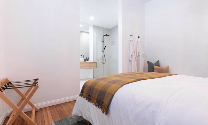 The master bedroom features a comfy queen bed and a luxurious ensuite with a walk-in shower, toilet, and spacious bench (please note, there is no door). The second bedroom also has a queen bed with plush bedding and is located opposite the formal lounge, just a few steps down the hall from the bathroom.