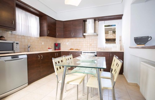 The kitchen is fully equipped with an oven with grill, 4 cooker rings, a microwave oven, a dish washer, a coffee maker for filter coffee and espresso, cooking kitchenware, a big refrigerator with freezer, serving utensils, a baby chair and a dining table.