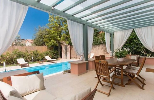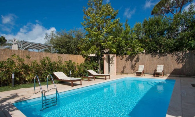 Charming villa with private swiming pool (8m x4m deep 1,30m) speads on 2 different levels, with beautiful enclosed and lighted garden, 400 meters far from the beach, it can accomodate up to 8 people!