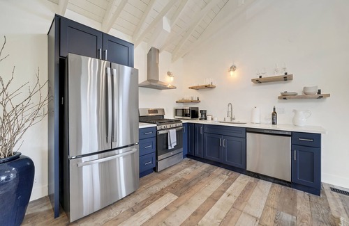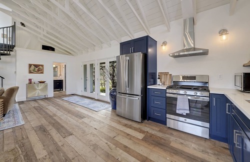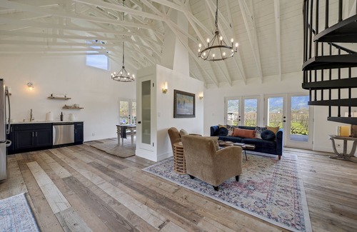 The rustic yet elegant Villa opens to an expansive Kitchen-living-dining combo area with tall open-beam ceilings and reclaimed wood flooring. Indoor-outdoor access is seamless as many French doors can be opened to enjoy a full immersion into Calistoga vineyards!