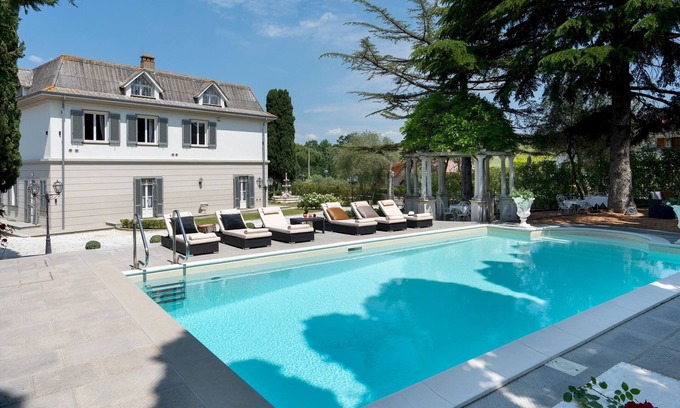 Villa Irma, located in Casciana Terme in the Pisan hills of Tuscany, has been recently renovated in every single detail, customising it with taste and charm, thanks to the use of prestigious materials in an optimal high-profile architectural research of the finishes complementary to the use of the villa. The three-floor structure evokes French Art Nouveau style with the dove grey and ivory colours of the external walls and the stylised rinceaux motifs for the windows and glass doors. Indoors, the novel design path is characterised by elegant forms, pure colours and contemporary objets d'art: all the rooms have been lightened with luxurious custom-made furniture whose design is inspired by refined modernity, the exclusive upholstery and accessories create a warm atmosphere bestowing on the villa high standards of quality and comfort. The clean lines are balanced by the prestigious Italian herringbone parquet flooring in the bedrooms and living areas; the bathrooms of minimalist design with king size showers and suspended bathroom fixtures are all in prestigious marble with original slabs from the respective extraction areas of the renowned Carrara quarries; in the kitchen, the total white decor is combined with furniture in white lacquered wood with a black alabaster worktop of contemporary lines. The decorative stuccos of the ceilings create dynamism and elegance in all the rooms in a duality of shapes that replicate the rectangular lines of the rooms and the circular shape of the lighting fixtures. The top floor consists of a living room with billiard table, bar and TV lounge in which the volterrane floor evokes the style of the large fireplace, and the white herringbone boiserie on the walls links with the slightly sloping ceiling. The villa is set in an Italian garden planted with lawn with large larches and cypresses that guarantee areas of natural shade, a large Baroque fountain with horses and shells to welcome us, stone statues integrating the appurtenances. The swimming pool lies in a secluded position, surrounded by a stone solarium, next to the romantic Art Nouveau gazebo in stone and wisteria. Villa Irma is located in the town of Casciana Terme, yet enjoys privacy thanks to the park being completely enclosed by walls and hedges, with the added advantage of having, just a few metres away, shops, services and the spa, reached on foot across the adjacent tree-lined avenue. Within easy reach of the villa are many destinations of great artistic and cultural interest such as the Tuscan towns of Pisa, Lucca, Florence, San Gimignano, Volterra and Siena, various renowned spas in the area such as those of Casciana itself, Uliveto and Montecatini, and the beautiful beaches of the Etruscan Coast, the Livorno coast and Versilia. Villa Irma is located in an area of rare beauty, alluring and interesting in every season, the ideal location to stay all year round thanks to the services at hand and the heatable swimming pool.