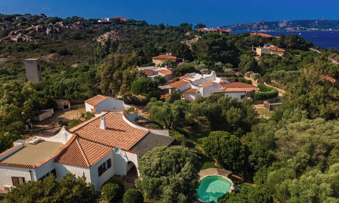 Villa Isa is situated in the hills of Porto Rafael on Sardinia’s northeast coast, a short walk away from La Sciumara beach. Indoors the single storey villa built in the 1970s in traditional Sardinian style, characterful features include a central fireplace, terracotta floors and natural stone details, complemented by simple furnishings and comfortable spaces for relaxing and dining. Outside, the villa is surrounded by trees and greenery. A second panoramic terrace is well equipped for al fresco living with its dining area, barbecue and built in seating. Sweeping views from the villa span the nearby town of Palau and the Maddalena Archipelago out to sea.