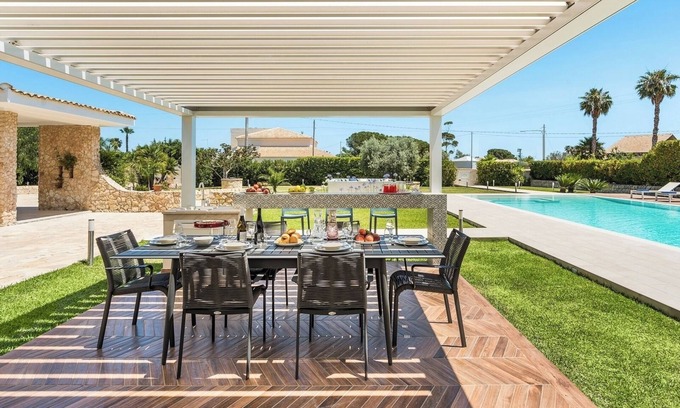 Villa Isabela is an elegant villa near Fontane Bianche beach, nestled in a serene landscape, within walking distance from shops, restaurants and the beach. The villa spans across a generous plot, blending indoor and outdoor living. The sea is only 600 metres way, with a rocky beach, while the sandy beach is only 1.2km away.