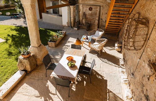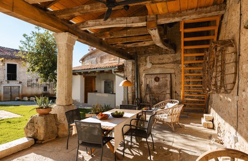 The villa features 3 fully equipped indoor kitchens and an outdoor kitchen, perfect for grilling or picnics. Six private bathrooms provide modern comforts, including showers, towels, and essentials. Relax on one of three balconies with scenic courtyard and Karst views, or unwind in the lush inner courtyard, complete with outdoor seating, a fireplace, and a cozy ambiance.