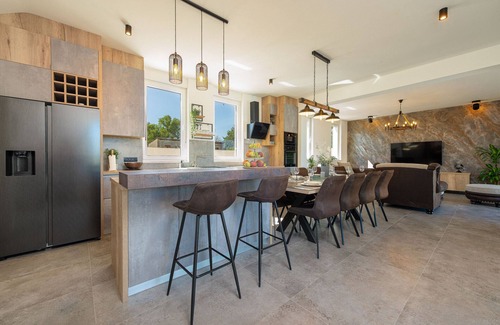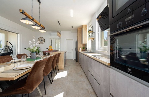 Villa La Aurora can accommodate 8 people in 4 bedrooms, 3 of which are with double beds and one with 2 single beds. One double bedroom with a private bathroom is located on the ground floor, while the other three bedrooms are upstairs. A large and fully equipped kitchen with a dining area continues into the living room with a view of the pool, and a Playstation 5 game console is available. This beautiful newly built and modernly decorated villa will delight you with details and shades in earthy tones that make it truly special. In addition to the unique interior, you will also be delighted by the size of the garden where you can enjoy on the sun loungers by the heated pool while sipping your favorite cocktail. This villa also offers an outdoor barbecue for preparing traditional Dalmatian specialties. Furthermore, the villa is ideal for families with children, and there are many facilities at your disposal; a table tennis , a table football, a basketball hoop, a playground for the youngest guests with a trampoline, swings and a slide...