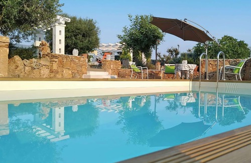 Villa La Rezza is a charming property with private swimming pool located in "Torre Ovo" on the north coast of Salento (on the Ionian Sea) not far from a beautiful sandy beach easily reachable on foot. The villa is situated on a natural hillock, far from the traffic, and surrounded by olive trees, thyme, rosemary and myrtle plants, it boasts a beautiful garden, a spacious terrace and several cool areas where you can spend pleasant days in the open air, sipping a glass of "Primitivo di Manduria" the typical wine of the area.