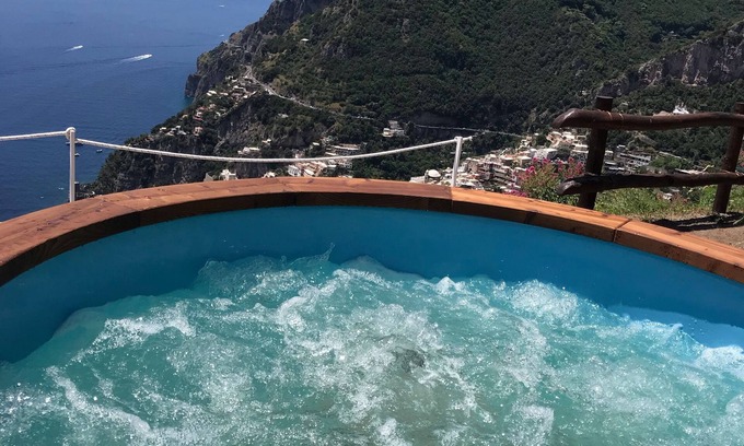 Outside there is a large terrace where you will spend most of your time enjoying the spectacular view. Infact one of the characteristics of the view is that you can see both the Positano and Praiano bays. There is an outside shower with a large shower head and hot and cold water and there is also a standard bath tub. When you have a shower or a bath, you have amazing views. The oversized Jacuzzi does not provide hot water so it is available using only from June .