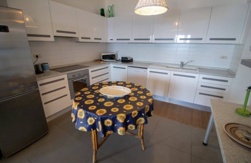 The apartment is on two levels. Ground floor made up of kitchen and large living-dining area, double bedroom with entrance also from the garden, bathroom with shower, large porch with sea view. Upstairs sleeping area consisting of two triple bedrooms and one double bedroom, bathroom, bathroom with shower and large terrace with sea view. In the house there are two cots if necessary for children up to 10/12 years.