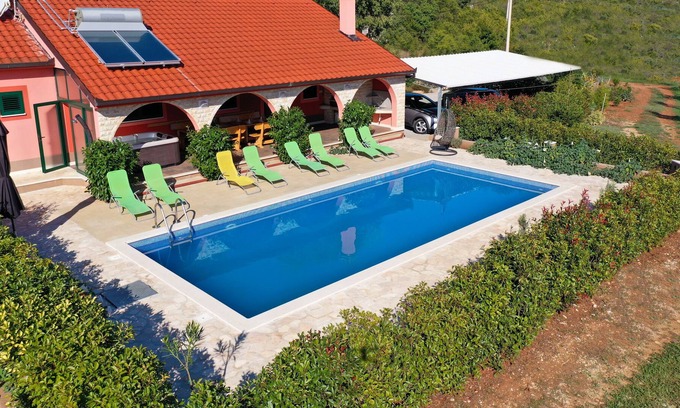Villa located in a small village with spacious veranda for your friends or family. There is a spacious swimming pool where you can enjoy during the hot summer days and evenings and there is a jacuzzi on the veranda if you feel summer breeze
