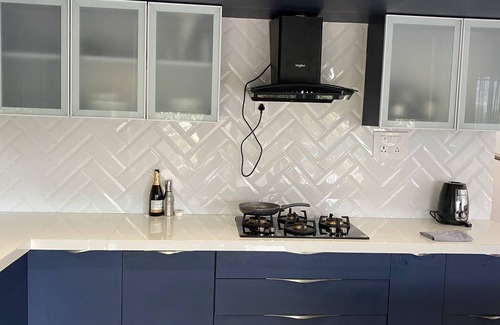 A tastefully done living room and well equipped kitchen with utensils, crockery and cutlery, water purifier and refrigerator, TV is available
