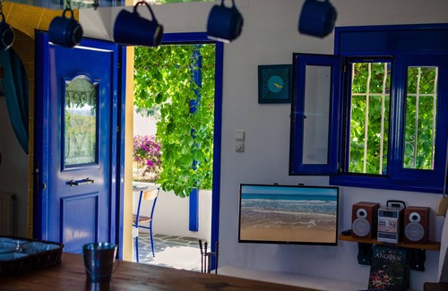 The interior of Villa Marqua includes three enchanting bedrooms fashioned in the customary island style with traditional handmade king size beds offering their occupants the tranquility and rest they need on their vacation. An open-plan room includes a spacious lounge area with fireplace, stereo sound system and flat screen television for countless moments of relaxation, as well as a fully equipped country style kitchen where our guests are invited to try out their culinary skills. A cozy rustic dining area is located in the same space. The upper floor includes an open-plan room which includes the third bedroom with a traditional iron bed, a lounge-sitting area with two sofa beds and a bathroom with a shower. There is a small balcony facing the back yard and on the front you will find a big veranda with unique views to the Aegean sea.
