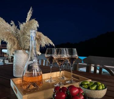 Food & DrinkFruit, Tea/Coffee maker, Chocolate/Cookies, Wine/ChampagneBathroomShampoo, Bathtub or shower, Private bathroom, Conditioner, Hairdryer, Walk-in shower, Free toiletries, Towels, Bathrobe, Body soap, Toilet paper, ShowerMedia & TechnologyMobile hotspot device, TV, Pay-per-view channels, Flat-screen TV, Streaming service (like Netflix)GeneralTile/Marble floor, Heating, Private entrance, Key access, Hardwood or parquet floors, Fire extinguisher, Trash cans, Iron, Soundproof, Air conditioningOutdoorsPatio, Barbecue, Private pool, Outdoor dining area, Balcony, Outdoor furniture, TerraceKitchenToaster, Wine glasses, Kitchenware, Washing machine, Dryer, Refrigerator, Kitchen, Oven, Electric kettle, Cleaning products, Stovetop, Dining table, Coffee machine, DishwasherLiving AreaDesk, Sitting area, Dining area, SofaBedroomExtra long beds (> 6.5 ft), Childrens' cribs, Wardrobe or closet, LinensViewGarden view, Pool view, View, Mountain view, Sea viewAccessibilityUpper floors accessible by stairs onlyBuilding CharacteristicsDetachedRoom AmenitiesNon-feather pillow, Socket near the bed, Sofa bed, Clothes rackEntertainment & Family ServicesBoard games/puzzles, Baby safety gatesPool and SpaInfinity Pool, Pool towels, Pool with a viewPhysical distancingSingle-room AC for guest accommodationCleanliness & disinfectionHand sanitizer |