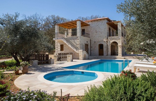 Villa Melpomeni is the latest super luxury addition to the complex of Vederi Estate. Is a complex multi award of four villas in a peaceful environment of an olive grove in the middle of green hills covered with cypresses and oaks. Ideal for relaxation and tranquility located next to the picturesque Prines village and just 10 minutes drive from the vibrant City of Rethymno and its wonderful sandy beaches. Villa Melpomeni is made of carefully selected local stone and wood in a unique design and decoration of traditional Cretan architecture that blends in harmony with the surrounding landscape, which can accommodate up to 10 people. Consists of 3 floors, has a fully equipped kitchen, a living room, gym, state of the art home cinema, dedicated meditation space, 5 bedrooms with ensuite bathrooms jacuzzi, plus a WC. Located in the middle of a forest overlooking an olive grove and the sea. In the outside area you can enjoy the beauty of nature, as the whole property is surrounded by flowers, plants and olive trees. It offers a big private pool with a children's pool, sun loungers, outdoor dining table and a private garden.