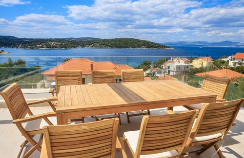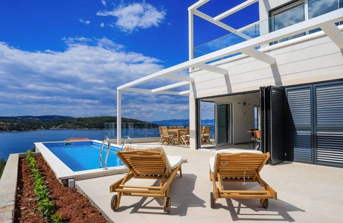 Villa Necu is a modern villa that enjoys sea views from its private pool terrace. Inside, there are 4 bedrooms and 3 bathrooms, accommodating up to 8 guests.
