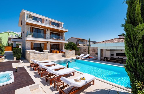 The Villa is situated on a 665 m2 property with a magnificent house of 191 m2. On it`s 3 floors, it provides communal and intimate areas. A total of 10 guests can accommodate the five bedrooms with double beds. Each of the bedrooms has an en-suite bathroom, that will allow a separate intimate space, as well as an exit to a beautiful balcony with outdoor furniture. The communal part consists of a fully equipped kitchen, dining room and living room and offers enough space for an uninterrupted gathering of family and friends. Going further in exploring this amazing space, you will find a kitchenette equipped with a seating area and a bar, to enjoy company while sipping on a glass of wine in a room inspired by dalmatian culture and décor. There are also three additional toilets throughout the Villa.