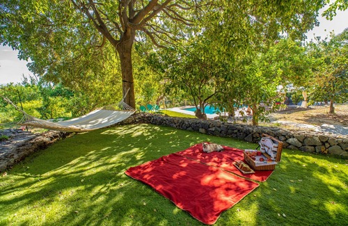 Villa Oliva is suitable for hosting large groups who want to spend an unforgettable vacation all together. It is spread over several levels for an area of about 300 square meters. On the ground floor in the original palmento made of lava stone with wooden beams are: patio, study, fireplace, living room, living room, large and modern kitchen with stone wood-burning oven , dining room, bathroom, laundry room. On the upper floors three double bedrooms , with bathroom and private balcony; kitchen, dining room, double sofa bed, bathroom ,double bedroom with Jacuzzi. In the outdoor spaces surrounded by open countryside , there are terraces for outdoor dining areas , BBQs and a large garden with green lawn and an ancient papyrus basin.