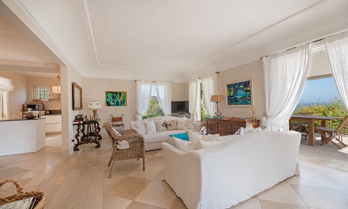 The villa is shaded by maritime pines and surrounded by Mediterranean scrub, recently renovated, and is on two levels: The upper floor houses a large living room with comfortable sofas and a TV corner, communicating with the dining area and the fully equipped open kitchen. Large panoramic windows allow you to enjoy the blue sea and romantic sunsets. On the same floor two spacious bedrooms, one with en suite bathroom - a second bathroom with shower and a study with access to the terrace to work in absolute tranquility. A service bathroom with washing machine.