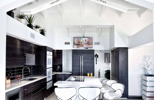 Situated in the lush green hills of Sint Maarten in the exclusive area of Oyster Pond Estates is Paradiso, a six-bedroom, six-and-a-half bath villa, is truly a gem of a villa. The minute you walk through the magnificent front doors, the astounding panoramic views of Dawn Beach, Oyster Pond and the gleaming Atlantic Ocean beyond will greet you. The pristine and contemporary decor of the living-dining area areas accents this wonderful view with the bright white furnishings and glass table tops complimented by exclusive artwork and sculptures.