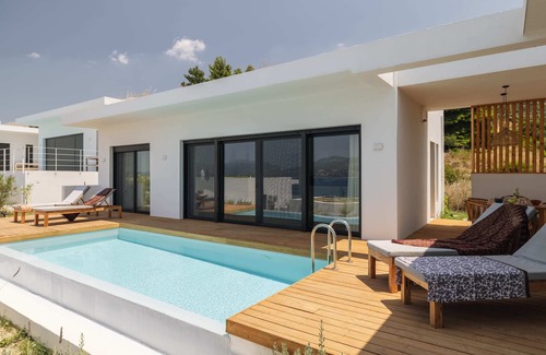 The lounge and kitchen also have stunning views as the entire side facing the sea is glass, with doors that open out to the external areas and the pool. The modern kitchen is fully equipped with the all the essentials required, coffee maker, microwave, oven, hob, toaster, kettle and washing machine. The lounge offers seating where you can watch the sunrise and dream of the day ahead, read a book or watch the latest films on the 50" TV. A teak dining table is placed to give optimum views of the outer areas.